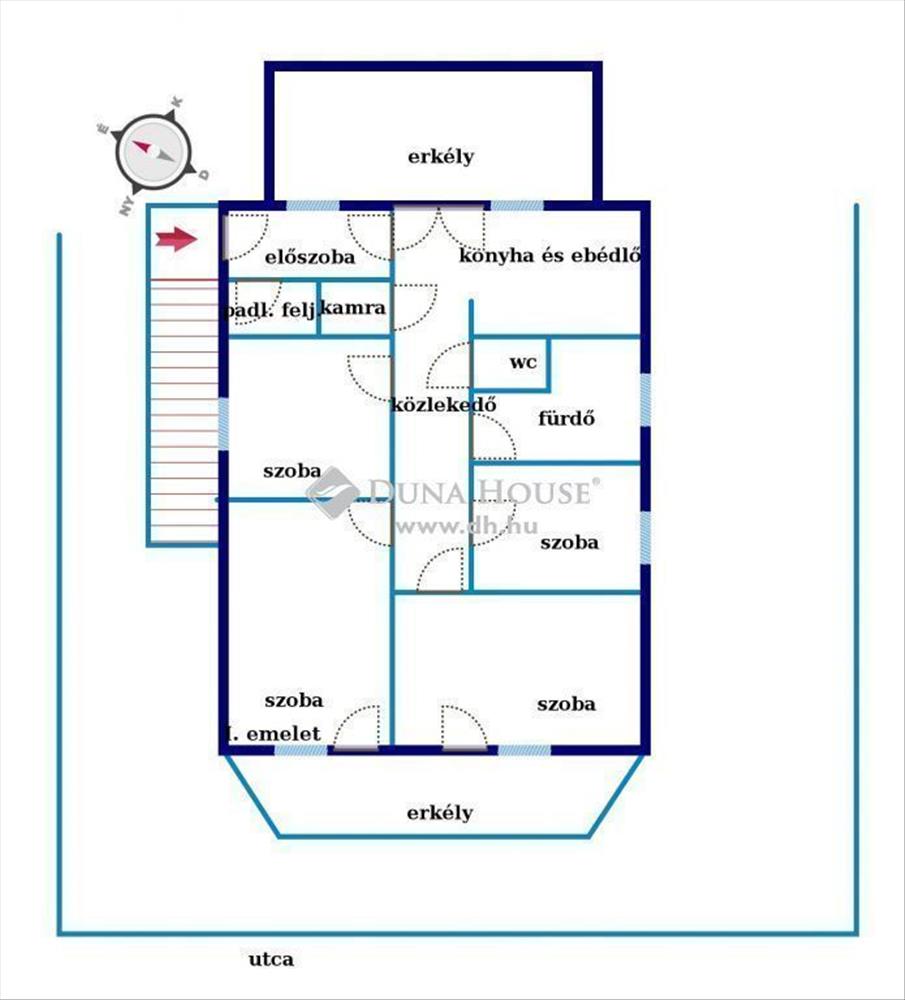 Az emeletre egy külső lépcsőn megyünk föl, és egy hosszú előszobába lépünk be. Innen tudunk továbbmenni a padlásra, és a konyhával együtt kialakított étkezőbe és a nagyon hosszú közlekedő folyosóra. a helyiségek így külön bejáratúak, és mindegyiknek van egy vagy több ablaka. a helyiségek mindegyike megfelelő méretű, a szobák nem kicsik és élhetőek. a fürdőszobában egy nagy méretű sarokkád található.