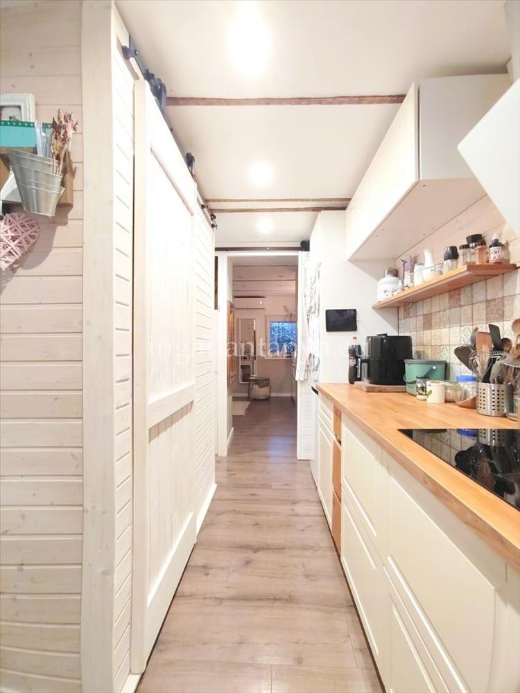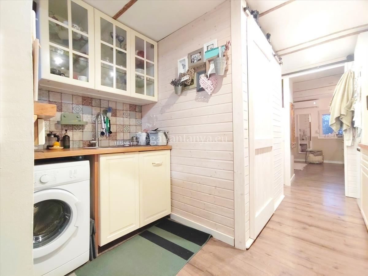 A házba lépve az előszoba/télikert található, ahol az étkezőis van, majd a szép konyha, mosogatógéppel, mosógép kiállassal. Sütő, főzőlap az ingatlanban marad. a fürdőszobában helyezkedik el a toalet is, mely még retro csempében pompázik.