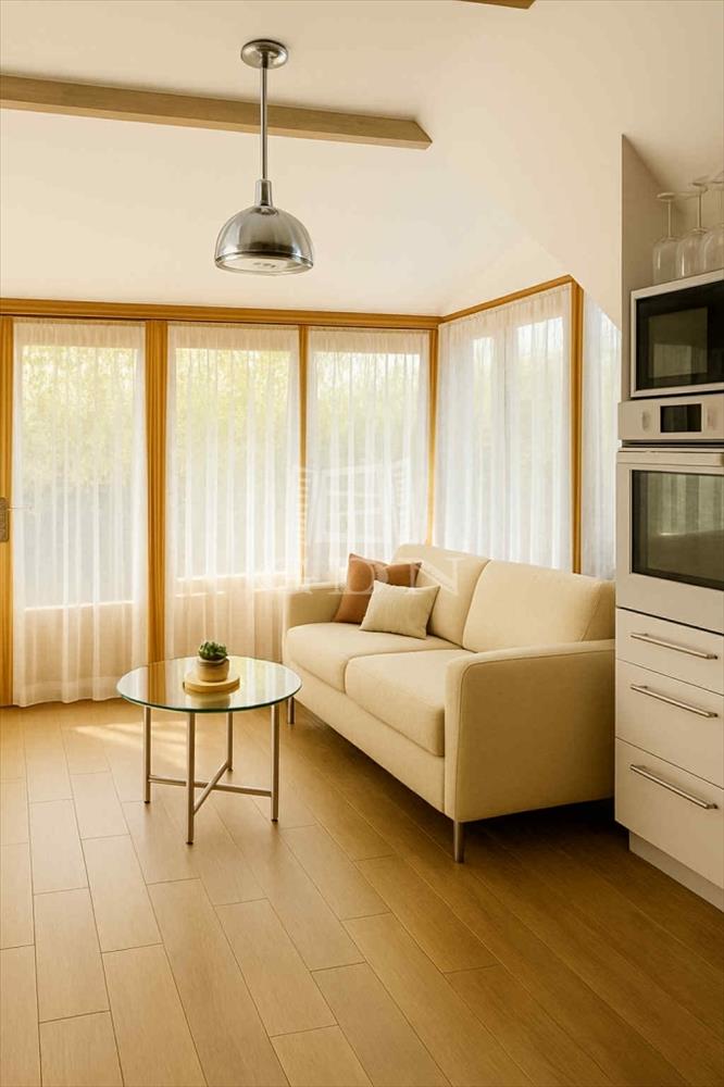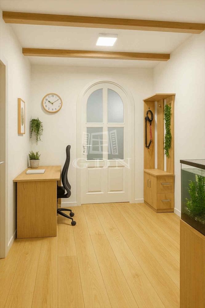 A földszinten helyezkedik el az amerikai konyhás nappali étkezővel, egy hálószoba, egy dolgozóként kialakított előszoba, valamint a kádas fürdőszoba. Az emeleten egy vendégszoba kapott helyet.