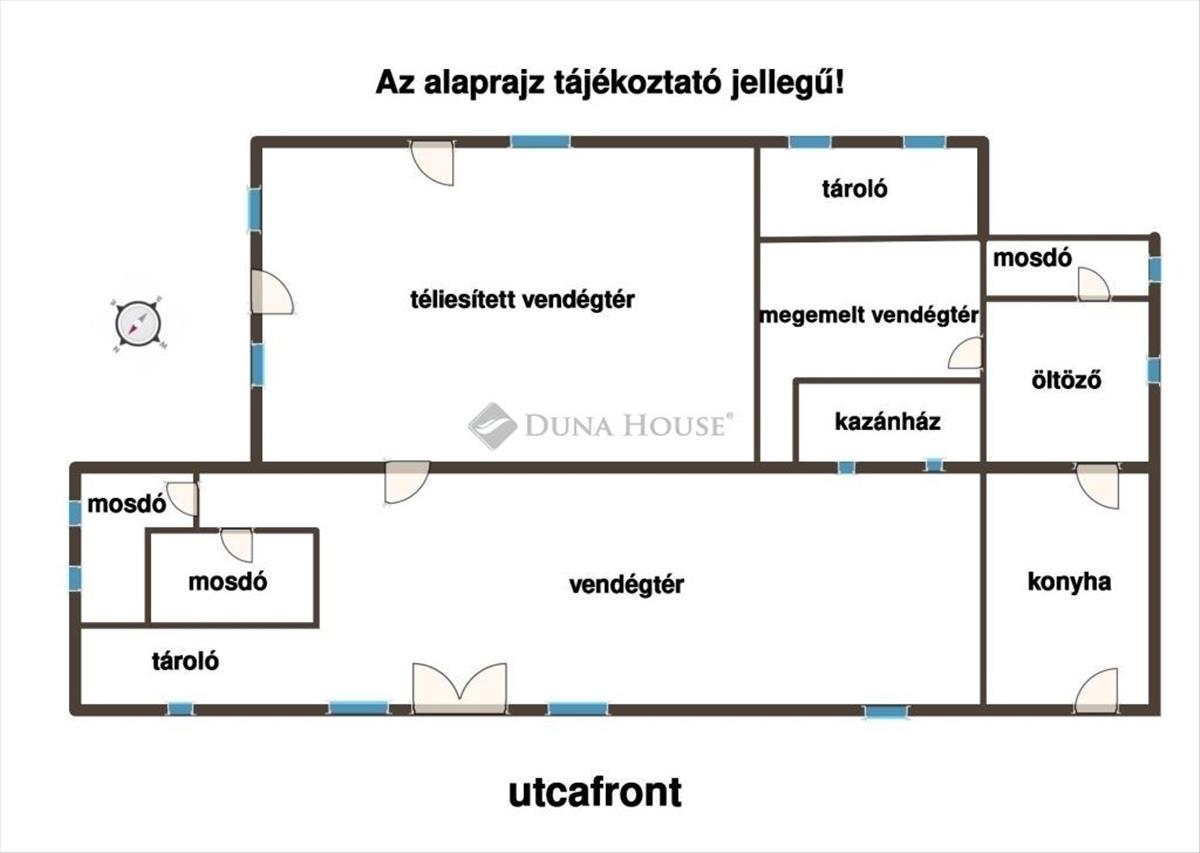 Helyiségei: vendégtér bárpulttal, konyha, öltöző, mosdók, tárolók, egy nagy fedett, továbbá egy szabadtéri kerthelyiség is.