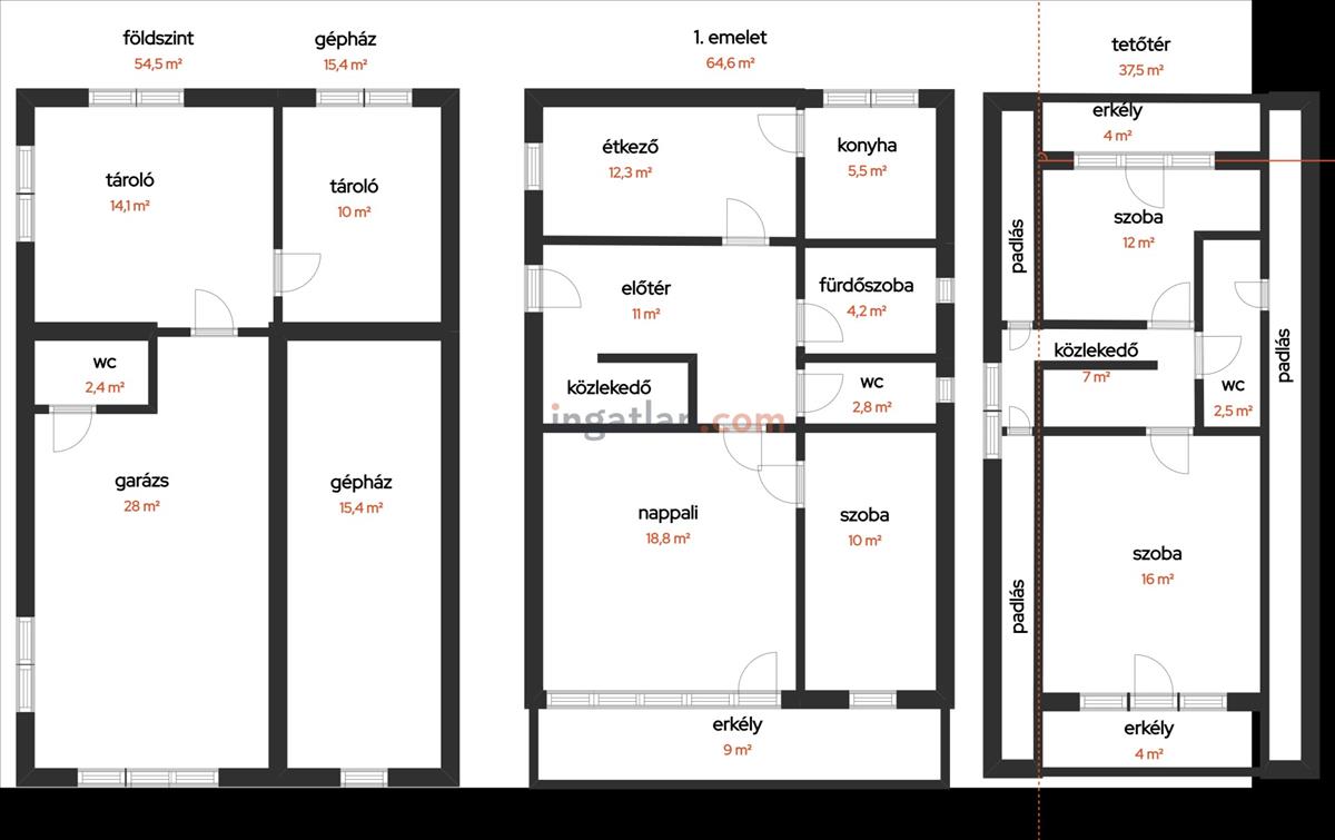 64, 6 m2 első emelet - előtér, étkező, konyha, nappali, szoba, fürdőszoba, wc