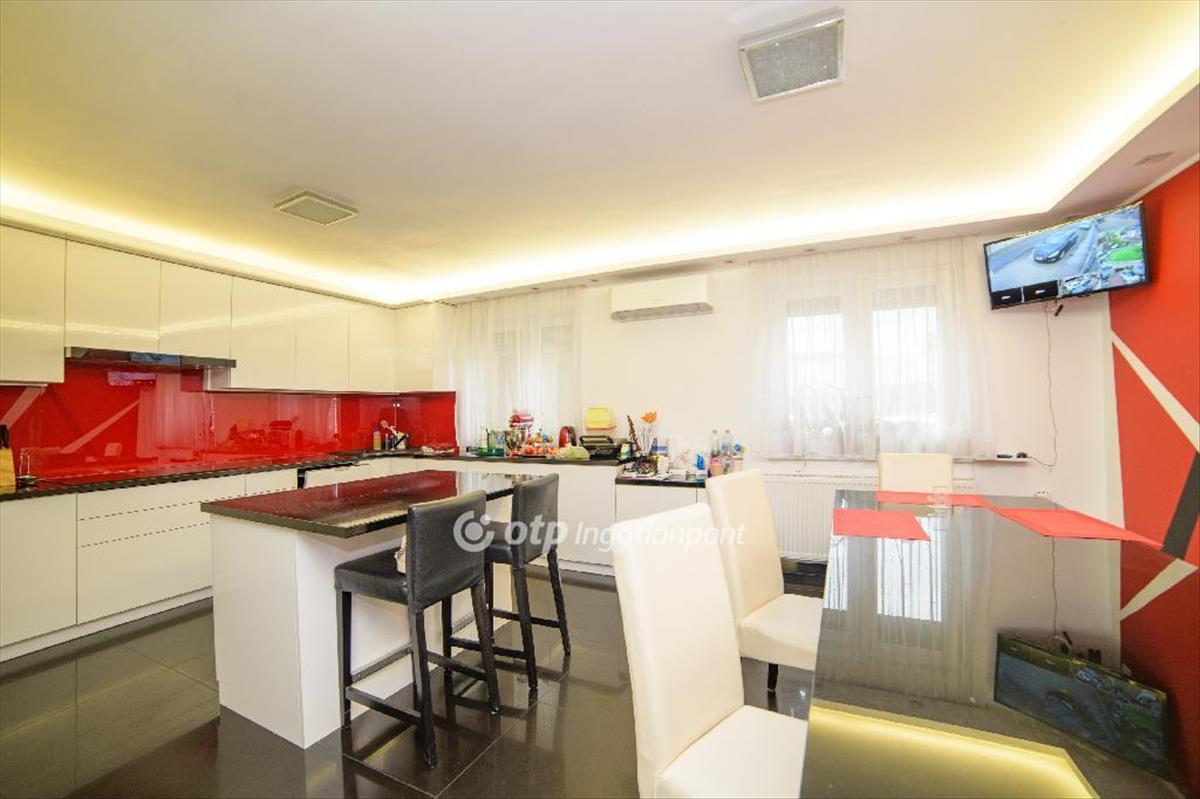 A ház alsó szintjén az előszobából nyílik a nagy 30 nm-es nappali, hátsó részén teraszajtóval. a nappalival szemben a 27 nm-es tágas, gépesített konyha található, magasfényű fehér beépített nagy méretű konyhabútorral, étkezőrésszel. a konyhabútor a vételár részét képezi. a terek világosak, légiesek, a mai designe-nak megfelelő burkolóval, mennyezeti megvilágítással. Ezen a szinten találunk még egy zuhanykabinos fürdőszobát és mellette egy mellékhelyiséget. Pár lépcsőt lehaladva a kazánház is innen közelíthető meg (jelenleg dolgozószobaként is funkcionál), ahol egy 24 kW-os kondenzációs gázkazánt építettek be puffer tartállyal 2018-ban, így ez is szolgáltathatja az otthon melegét. Innen egy hátsó kijáraton juthatunk a garázshoz.