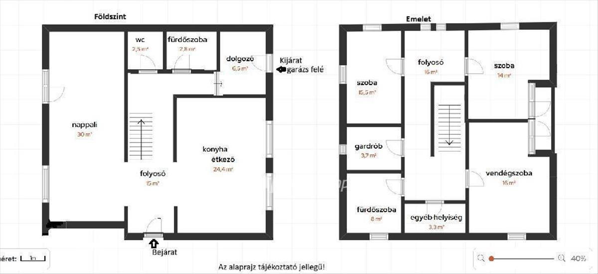 A felső szintre egy impozáns falépcsőn jutunk fel, ahol nagyon jó elrendezéssel vendégszoba erkéllyel, mosókonyha, mellékhelyiség, sarokkádas igényes fürdőszoba, hálószoba klímával - mely jelenleg gyerekszoba - és egy hatalmas hálószoba kapott helyet nagy gardróbbal, klímával felszerelve. a klímák mindenhol hűtő/fűtő berendezésűek.