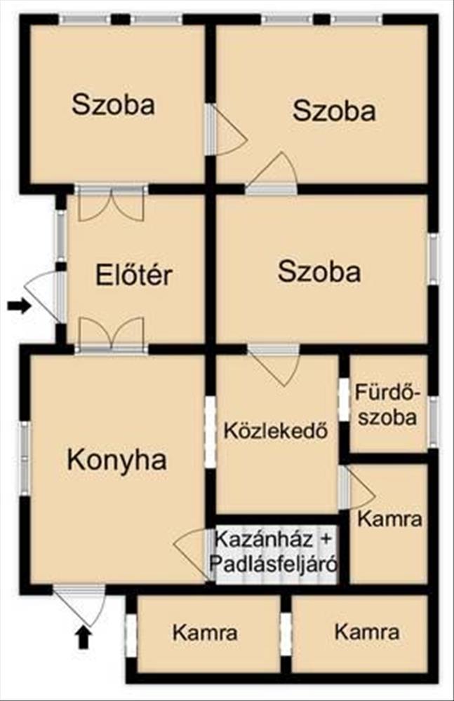 - Előtér, 3 szoba, fürdőszoba illemhelyiséggel, közlekedő, konyha, 3 kamra lett benne kialakítva.