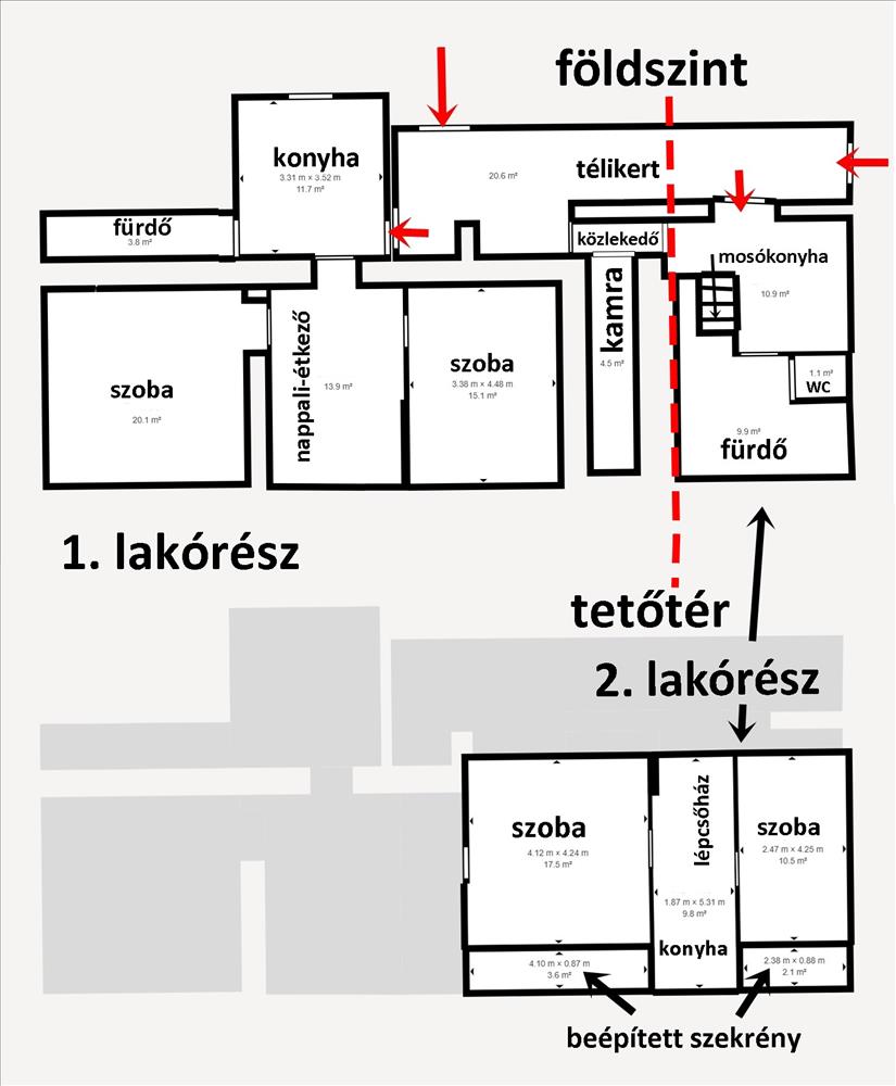 Az ingatlan két különálló, vegyes falazatú épületből áll. Az egyik épületben egy földszinti, 3 szobás, 69 m2-es 1. Lakórészt találunk, valamint egy földszint + tetőtér kialakítású 60 m2-es, 2 szobás 2. Lakórészt. a másik különálló épületben egy 65 m2-es, 2 szobás 3. Lakórész található. Az 1. És 2. Lakórészbe egy tágas télikerten keresztül juthatunk be.