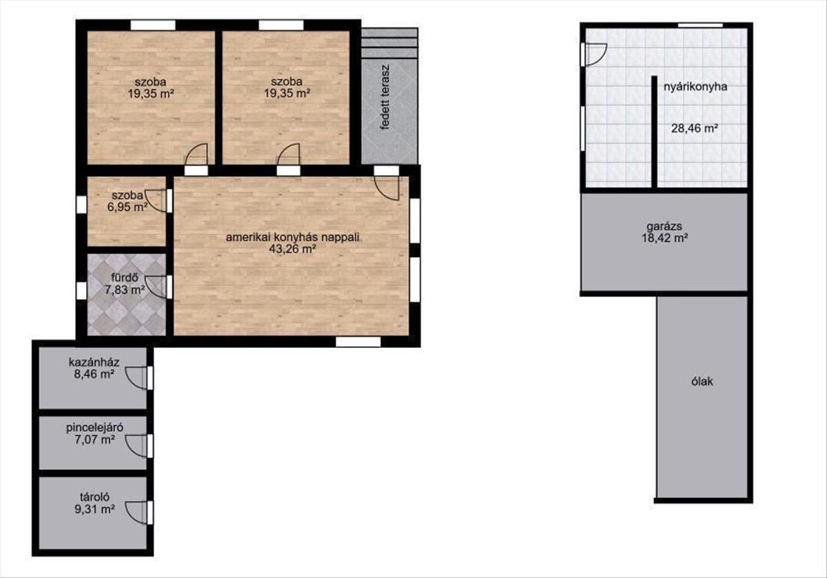 A különálló, szintén felújított épület további lehetőségeket biztosít. Akár 2 generáció együtt élését teheti lehetővé, vállalkozás számára is alkalmas, de nyári konyhaként is funkcionálhat.