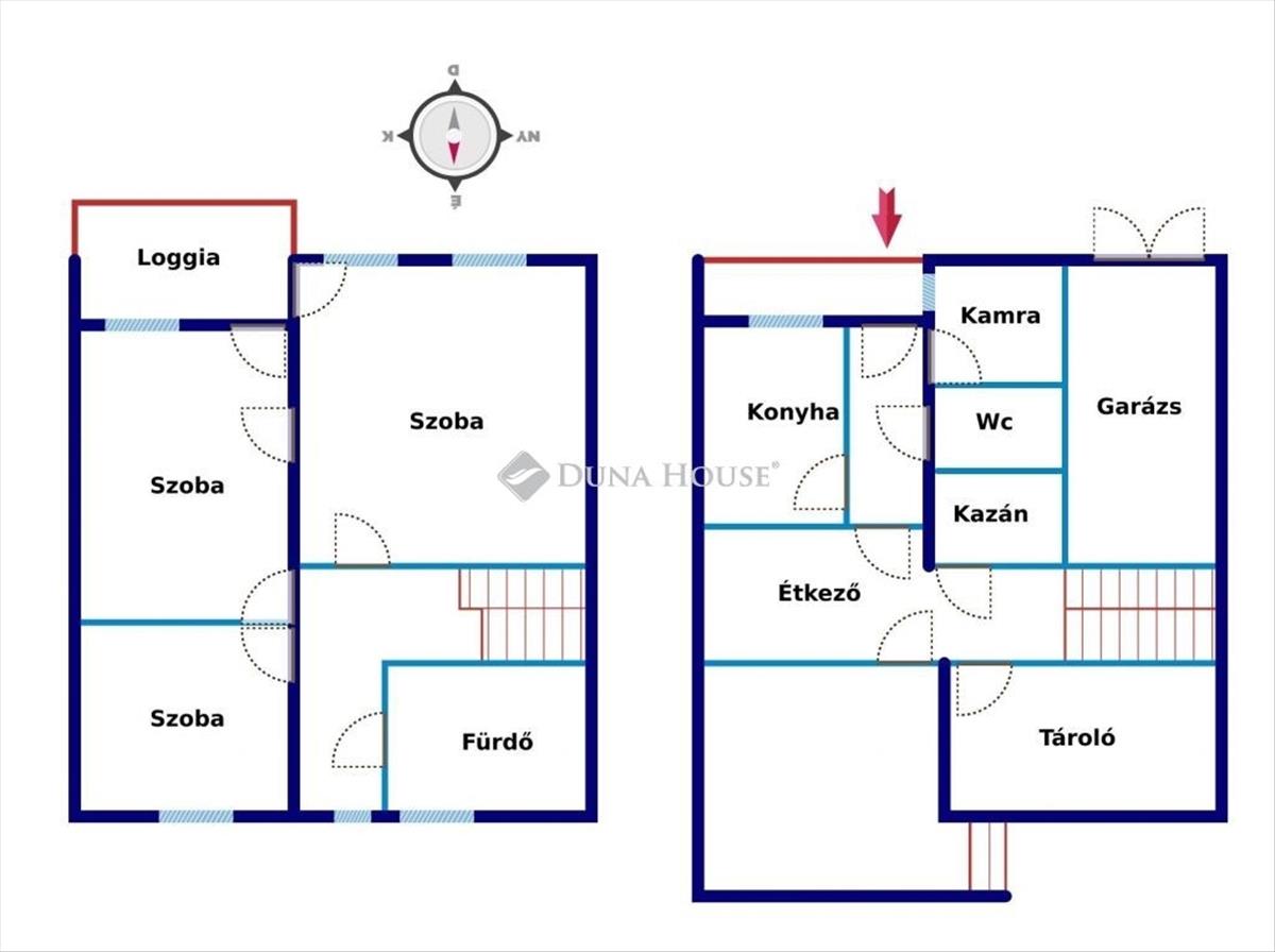 Az alsó szinten található konyha+étkező, szoba, fürdőszoba, wc, spájz, közlekedő, garázs, kazánház és a lépcsőtér.