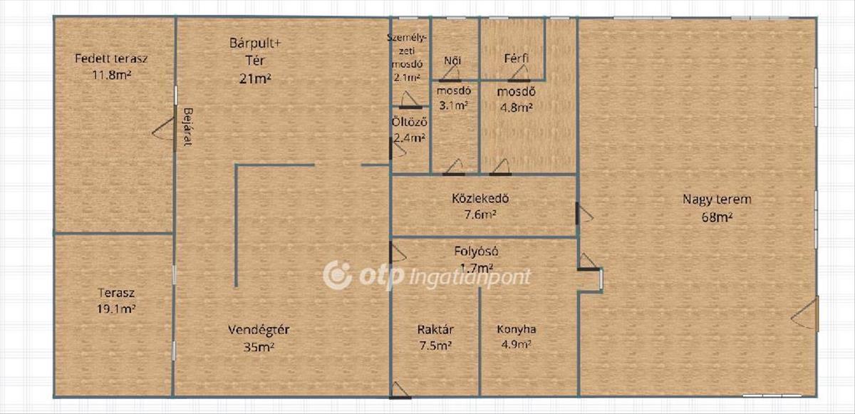 A hozzá tartozó üzlethelyiség korábban vendéglőként és sörözőként működött, és a benne található, kézzel készített, kiváló állapotú bútorok az ingatlan részét képezik ezek tökéletesen illeszkednek a hely hangulatához. Elöl egy fedett és egy nyitott terasz is található, ami ideális szabadtéri vendéglátásra. Az épületben elől található egy vendégtér bárpulttal, konyha raktárral, egy személyzeti mosdó, valamint egy külön közlekedőfolyosó, ami összeköti a vendégteret és a rendezvénytermet, és innen érhetők el a női és férfi vendégmosdók. a vendéglő három külön bejárattal is rendelkezik, ami nagyfokú rugalmasságot biztosít az új tulajdonos számára.