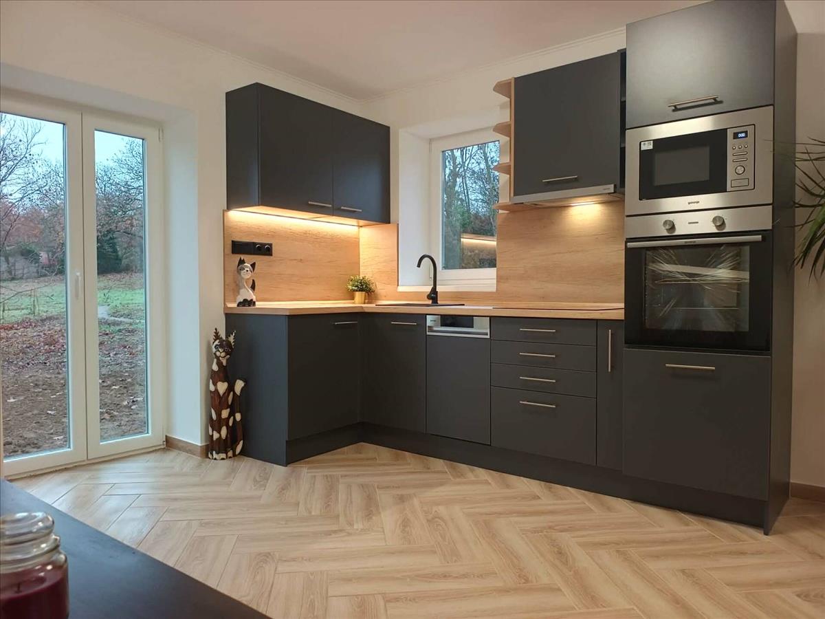 A konyha teljesen felszerelt, beépített Gorenje gépekkel: indukciós főzőlap, sütő, mikrohullámú sütő, mosogatógép és páraelszívó is rendelkezésre áll. Az épület új, hőszigetelt műanyag nyílászárókat kapott, a tetőtérben Velux tetőablakokkal. a tetőszerkezet teljesen új, 20 cm vastag szigeteléssel, a homlokzaton pedig 10 cm külső hőszigetelés biztosítja az energiahatékonyságot.