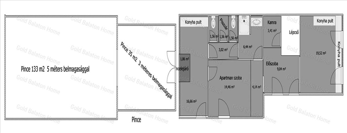 - a ház mellett boltíves pince található 2 helyiséggel, az egyik 133 nm-es 5 nm belmagassággal, amely egy 3 m belmagasságú 35 nm-es pincén keresztül közelíthető meg