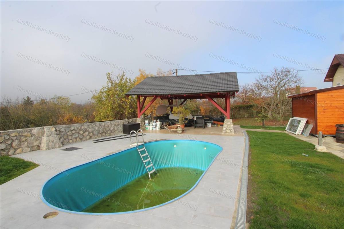 kertben tároló, szerszámosház, grillező és fürdőmedence is található.