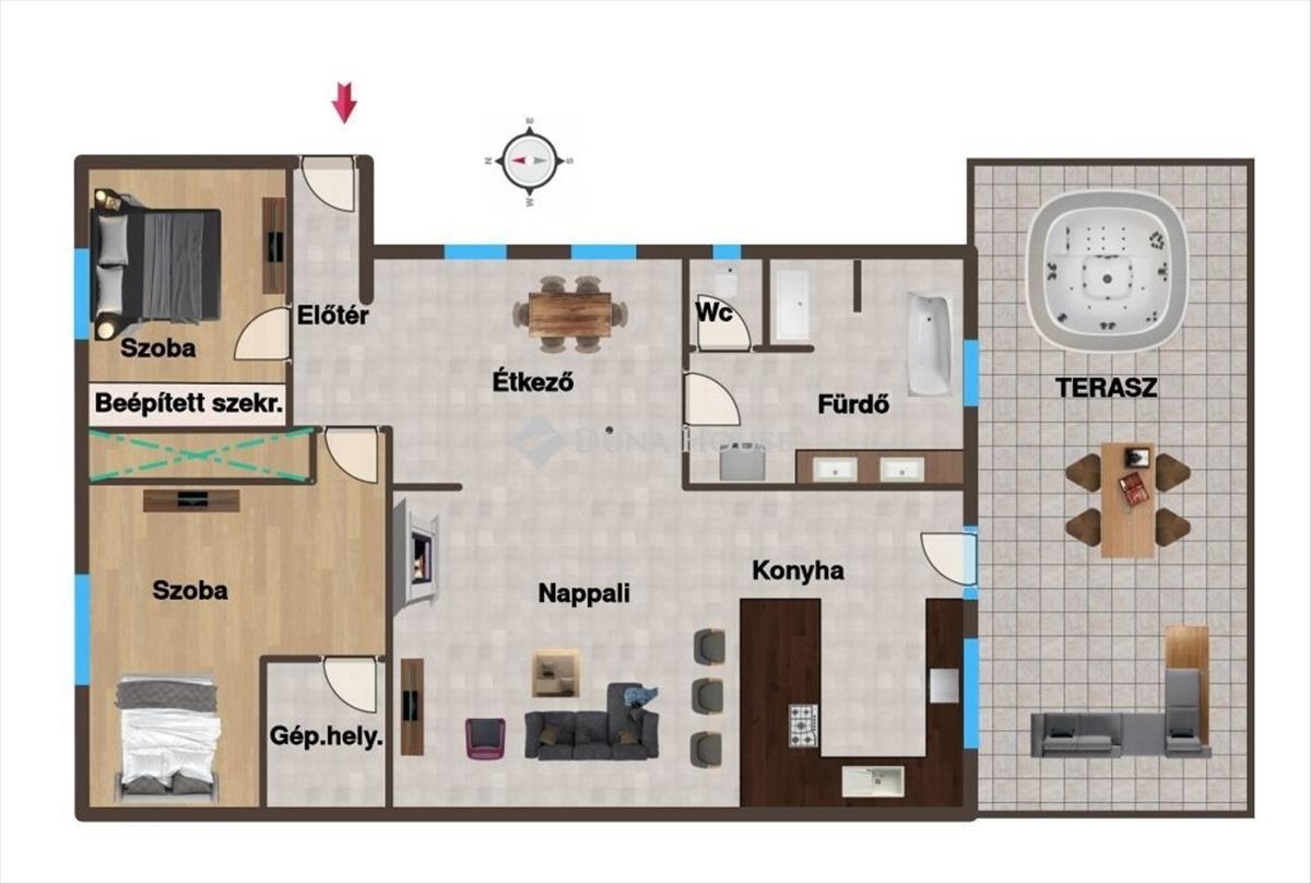 A lakórész területe: 96 nm , ehhez kapcsolódik még egy 43 nm -es terasz.