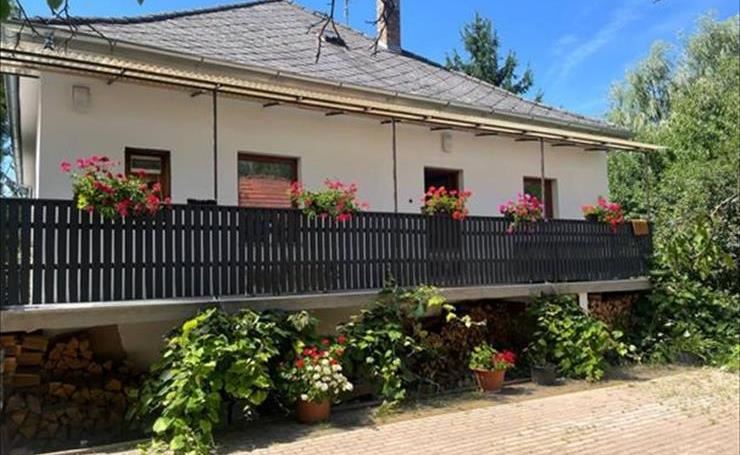 A ház előtt egy teljes házhosszúságú, hangulatos muskátlis terasz nyújt csodás panorámát a szemközti hegyekre – új burkolattal!