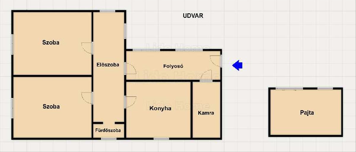 -Elrendezés: 2 szoba, előszoba, közlekedő, kamra, konyha, fürdő (kialakításra vár).