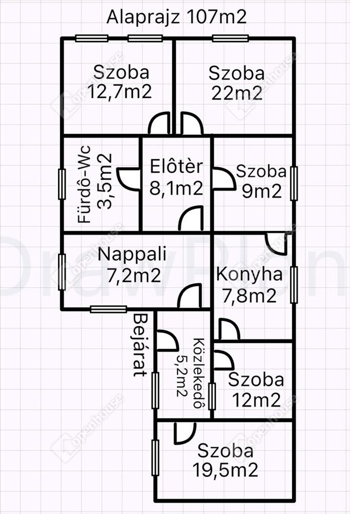 -Helyiségek 107m2 alapterületen : öt szoba, előtér, nappali, közlekedő, fürdő-wc, konyha. Telek területe: 1272m2.