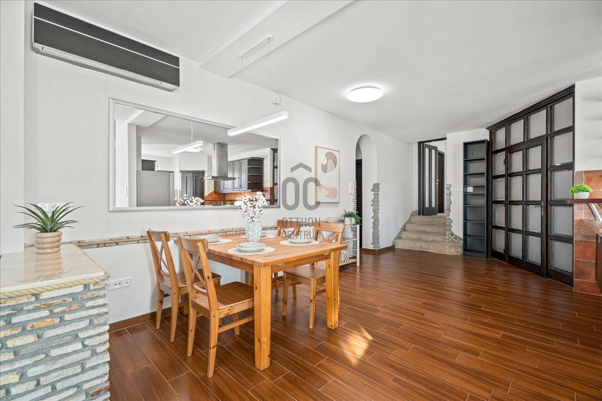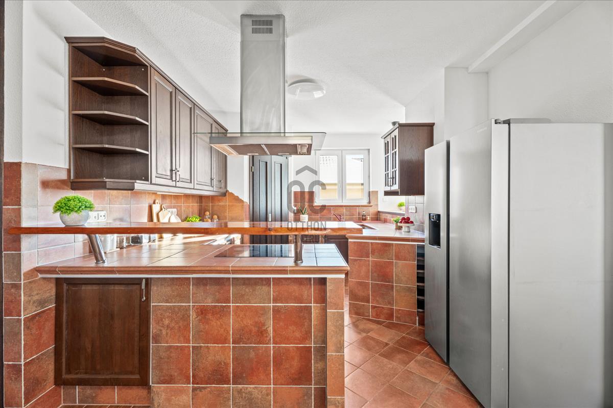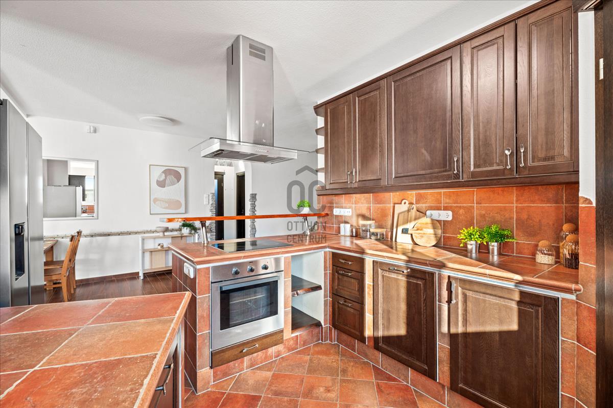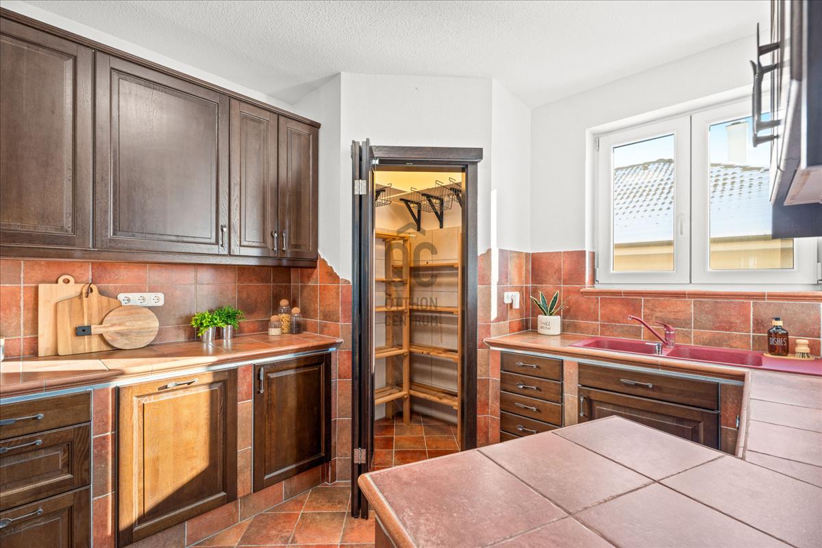 A komfortos méretű, gépesített, felszerelt konyhából egy praktikus kamra is nyílik, mely remek lehetőséget nyújt tárolásra. a konyha mellett kialakított tágas étkezőrész nagyobb családoknak is elegendő teret biztosít.