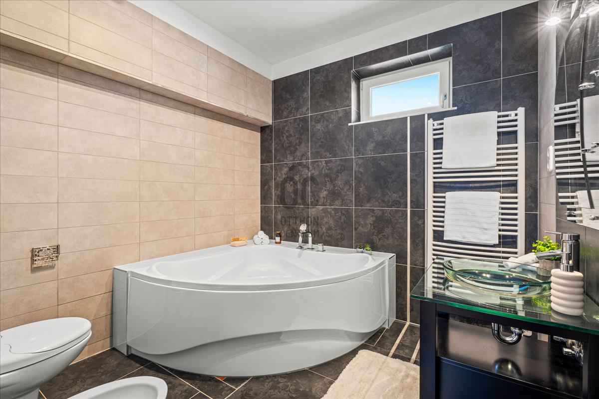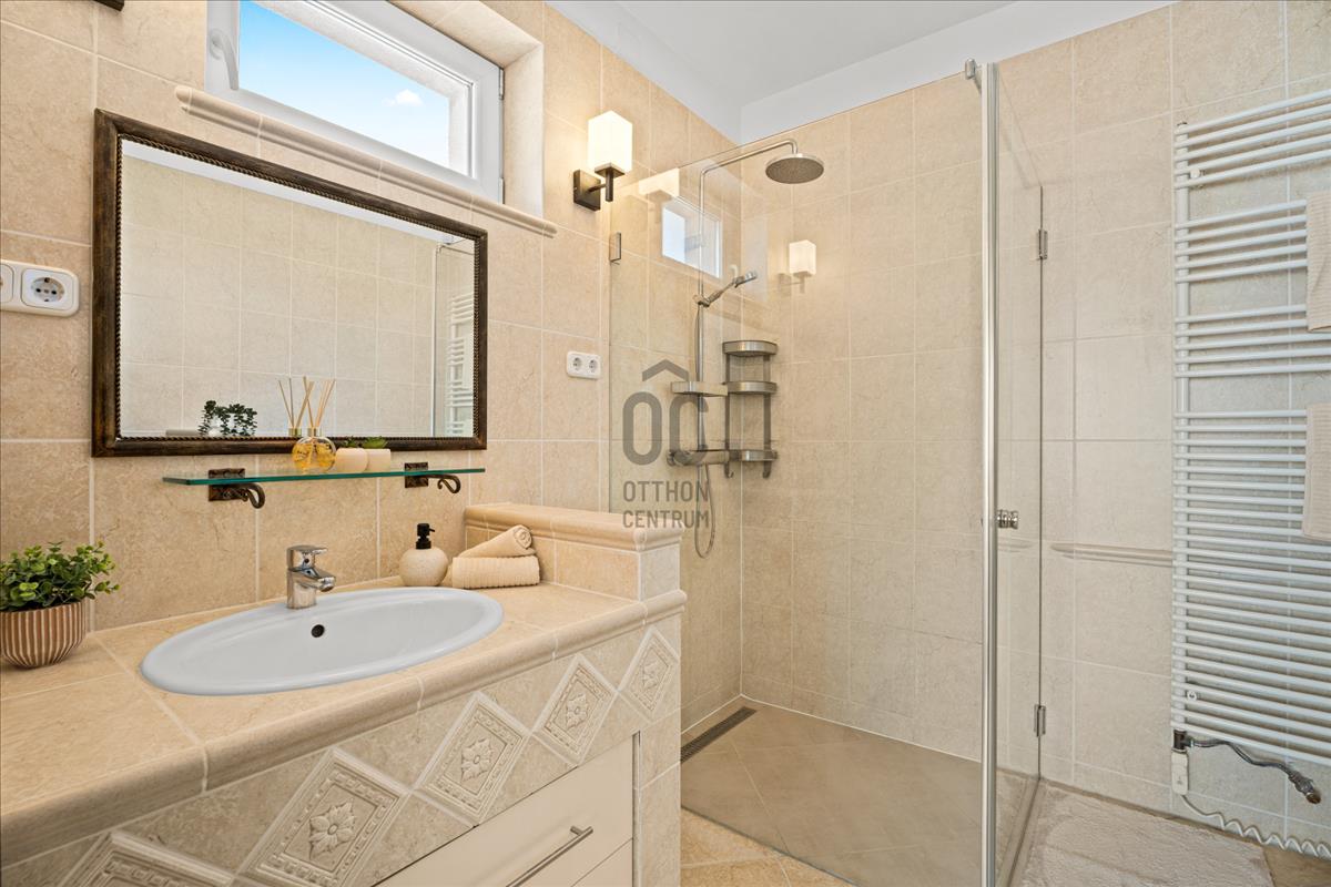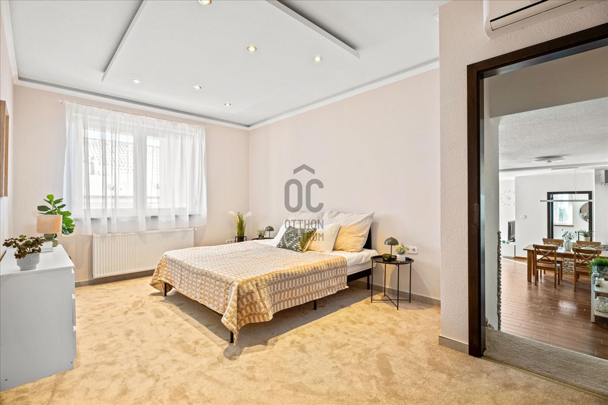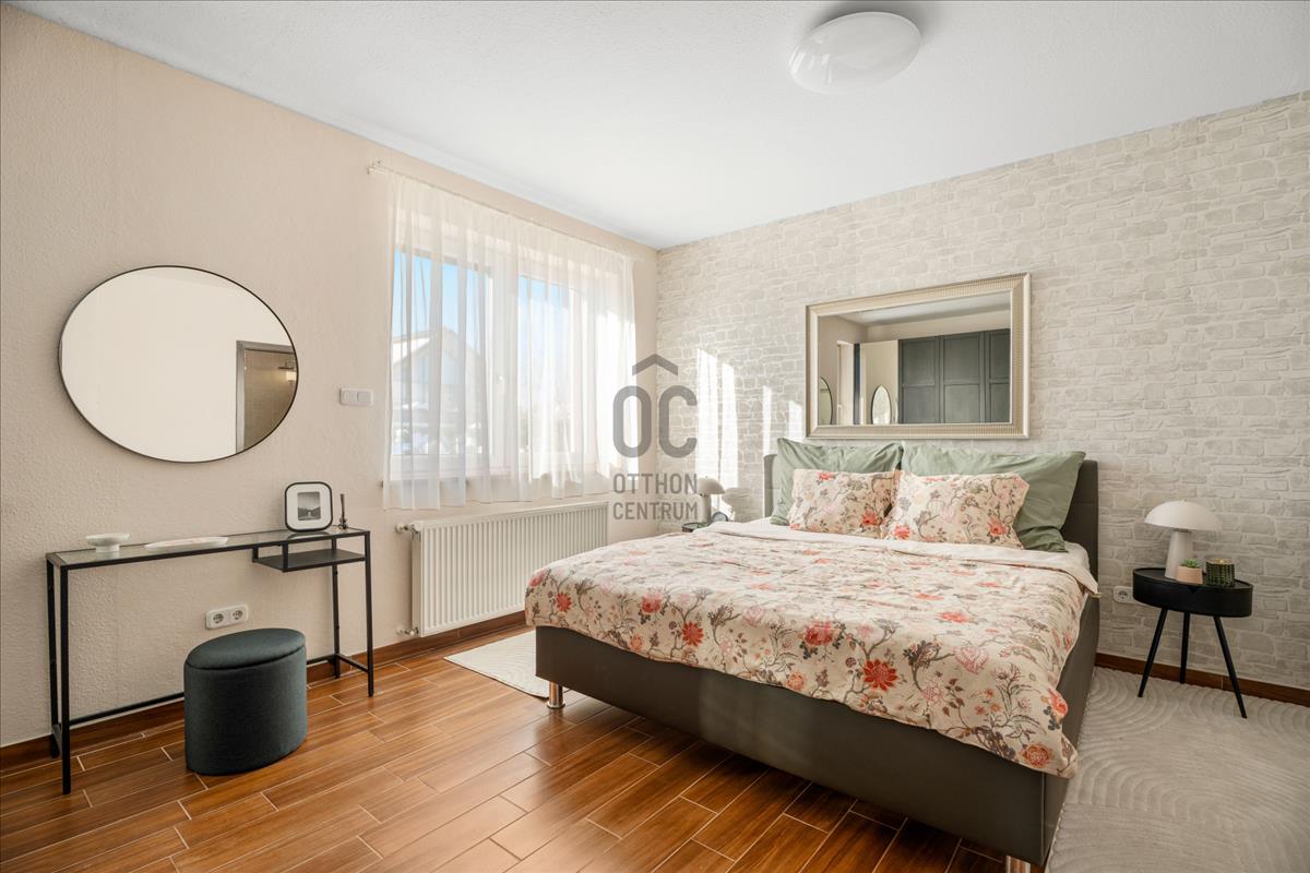 A 2008-ban, minőségi anyagokból épült tégla szerkezetű, hőszigetelt ház jelenleg két külön lakrészre tagolt (külön bejárattal), így ideális nagyobb családoknak, többgenerációs együttéléshez, vagy otthoni vállalkozáshoz is. Igény szerint a két lakrész egybenyitható, ezáltal egy nappali + 4 vagy 5 szobás, 3 fürdős házat kapunk, emellett a tetőtér beépítésére is van lehetőség.