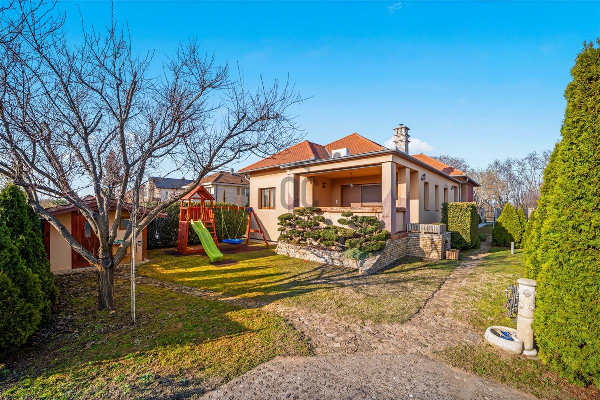 Csömör legkedveltebb részén, Majorszegiligeten, közvetlenül a XVI. kerület határán, az erdővel, mezővel határolt Árpádföldi úton eladó ez a különleges hangulatú, körbenapozott, összesen 222 m2 területű, igényes családi ház, fűtött garázzsal, parkosított kerttel, 653 m2-es telken!