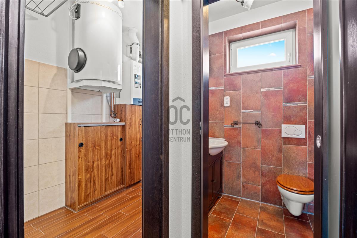 Külön vendégmosdó is kialakításra került, mellette funkcionális háztartási helyiséggel, itt kapott helyet a kazán, a mosógép és szárítógép is.