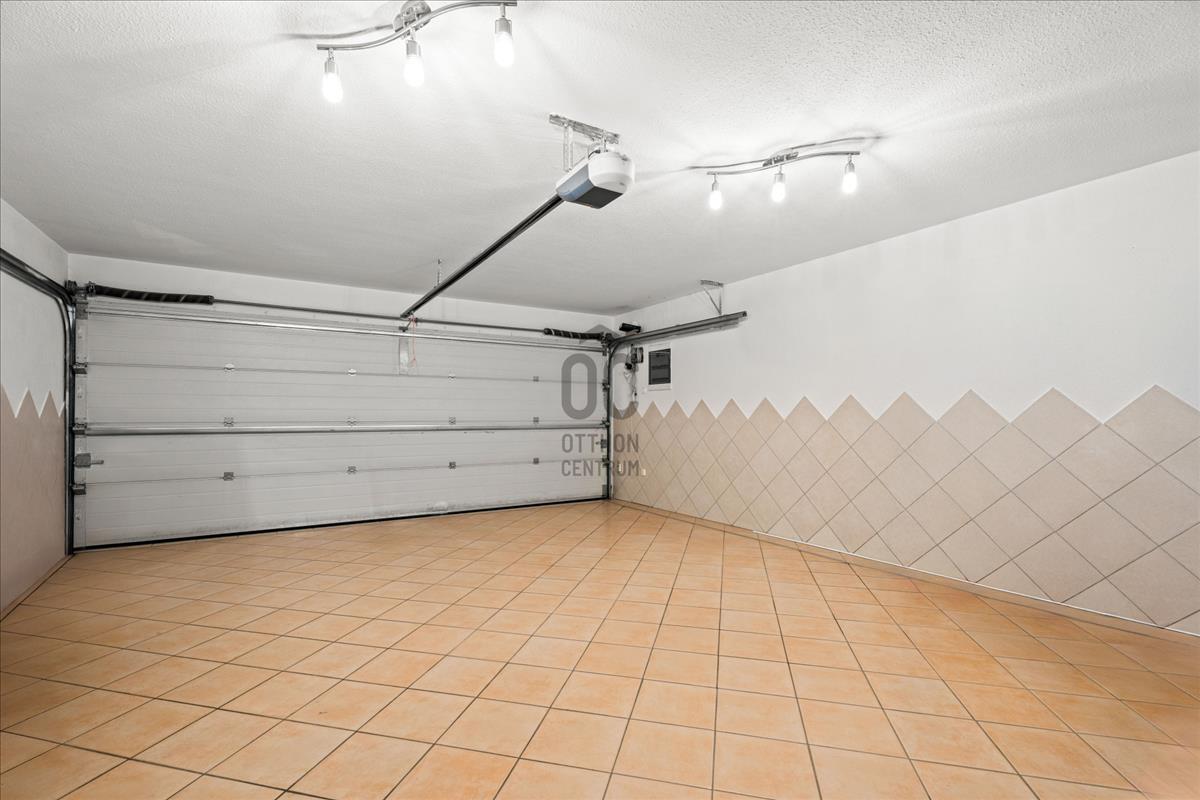 A garázs a fő lakrészből, belső lépcsőn és kívülről automata kapun keresztül is megközelíthető. Fűtött, tágas helyiség mely 2 autó számára kényelmes parkolást biztosít, emellett tárolási kapacitással is rendelkezik.