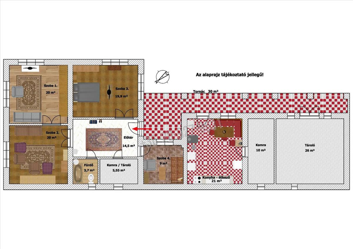 -adott négy szoba, hatalmas étkezős konyha + kamrák és tároló