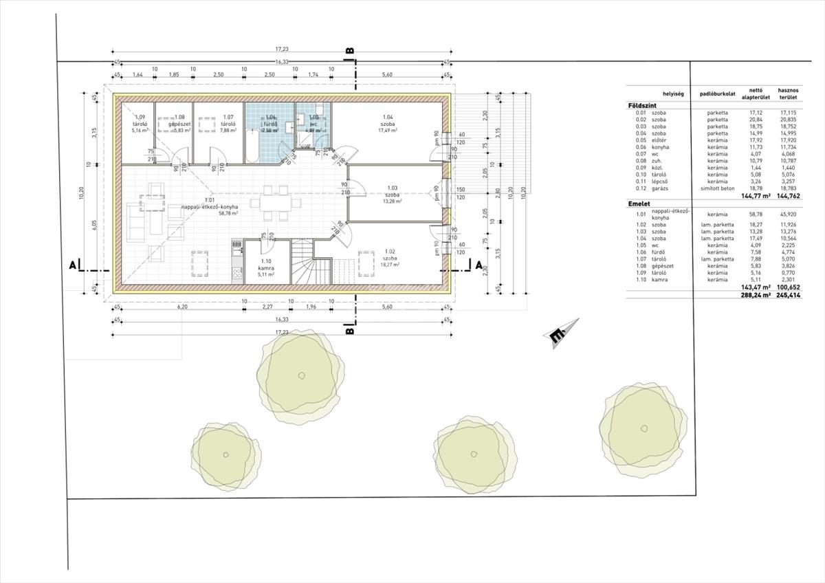 A két ingatlan úgy oszlik meg, hogy a földszinten van 144 nm hasznos lakótér és az emeleten pedig 101 nm.
