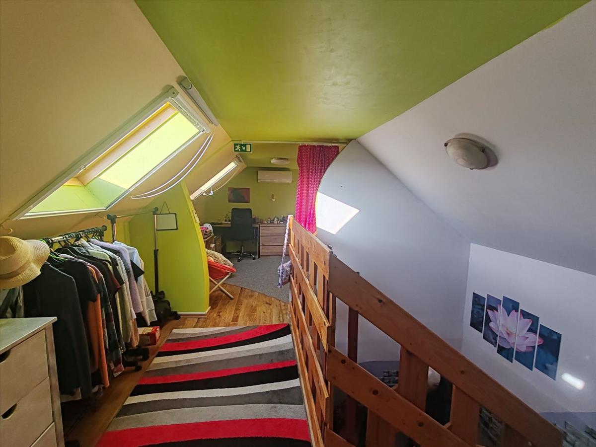 Itt a földszinten található 1 szoba melynek buroklata új laminált padló és innen nyílik egy gardrob és egy helyiség melyet ki lehet alakítani fürdőszobának.