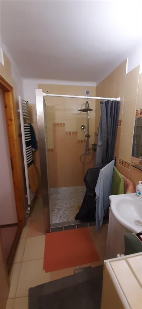 Fürdőszoba-WC burkolata új kerámia járólap a falak csempézettek új kerámia csempével található benne egy új épített tusoló, wc kézmosó.