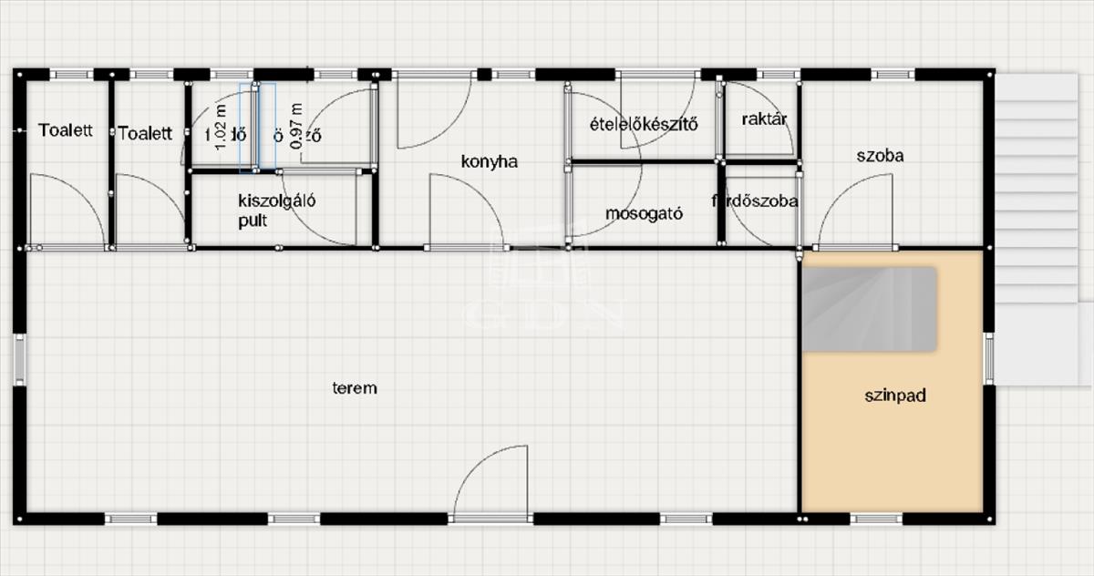 Az alsó szinten találunk egy nagy termet, a terem végén színpaddal, kiszolgáló pultot, 4 külön toalettet, az üzemi konyhához szükséges raktárakat, konyhát, mosogató helyiséget, öltözőt fürdőszobával. Ezenkívül egy szobát, fürdőszobával.