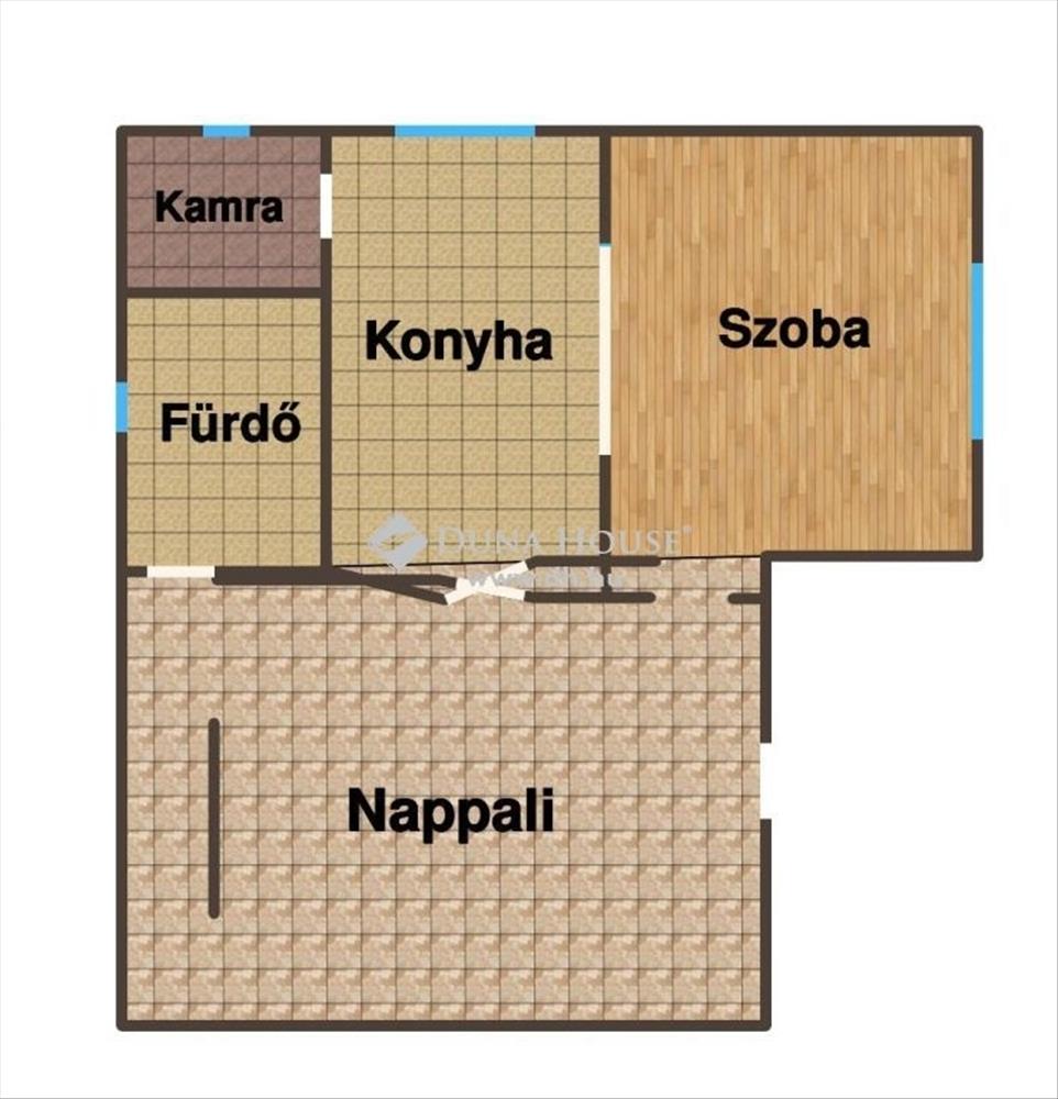 Földszint: nappali, hálószoba, konyha, kamra, fürdőszoba