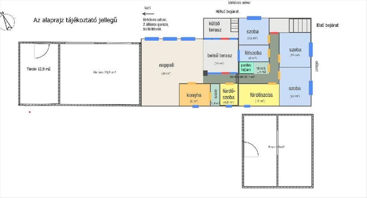 A telek egyik fele térköves, a másik pedig füvesített. Kettő darab garázs, egy kisebb nyitott tároló és egy 12 m2-es tároló található az udvaron. Csorna kb. 10. 000 Fős város az M85-ös gyorsforgalmi út által 30 perc alatt elérhető Győrből, illetve