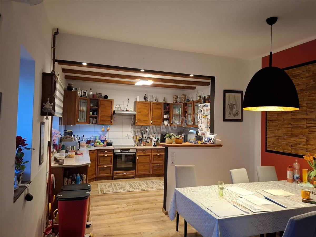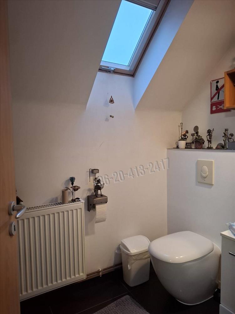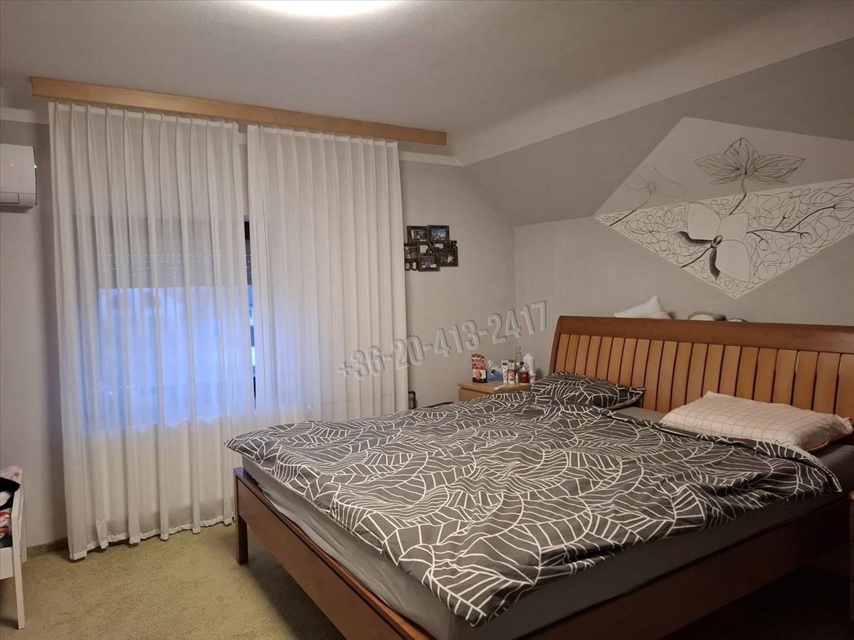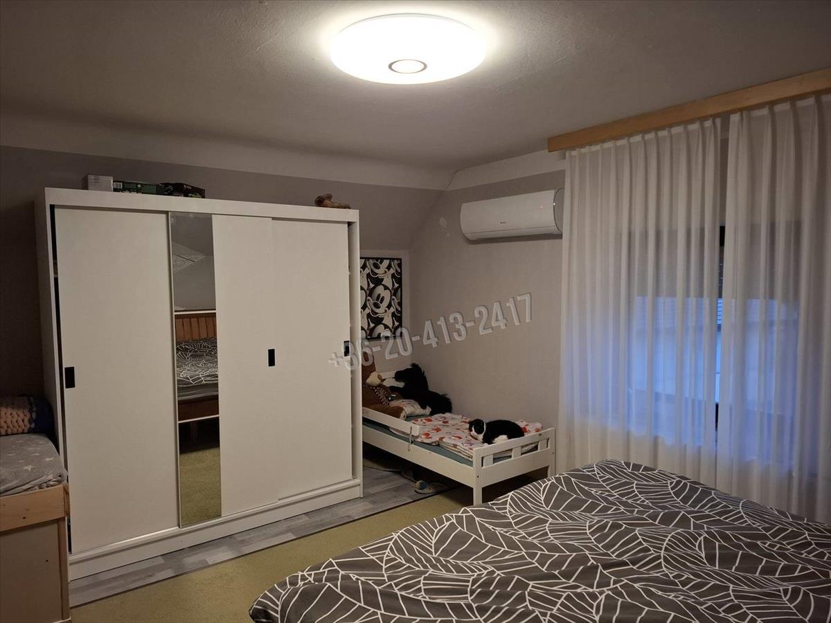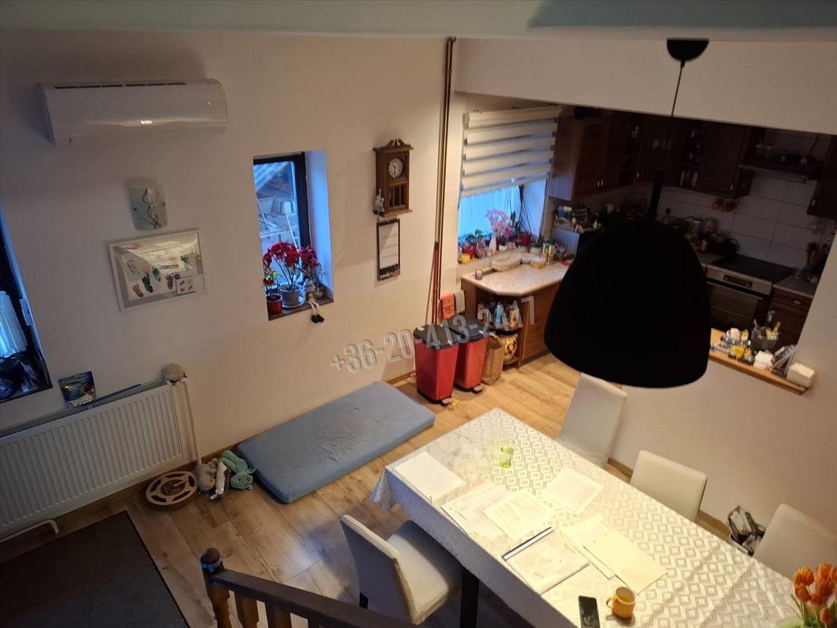 A családi ház felső része 124, 5 m2. Ebben található egy előtér, ebédlő, konyha, fürdőszoba, wc külön, nappali, 2 szoba, és egy kisebb emeletre felmenve még egy szoba, amiben van egy hűtő- fűtő klíma.