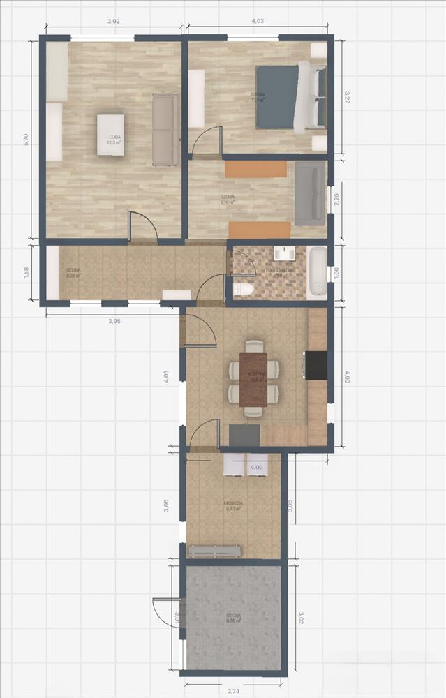 - Elrendezés: 2 szoba, gardrób, előszoba, konyha, fürdőszoba WC-vel, kamra/mosókonyha