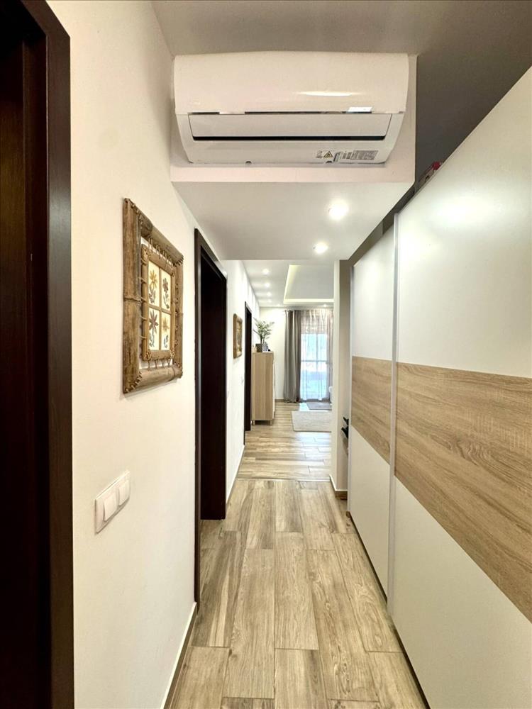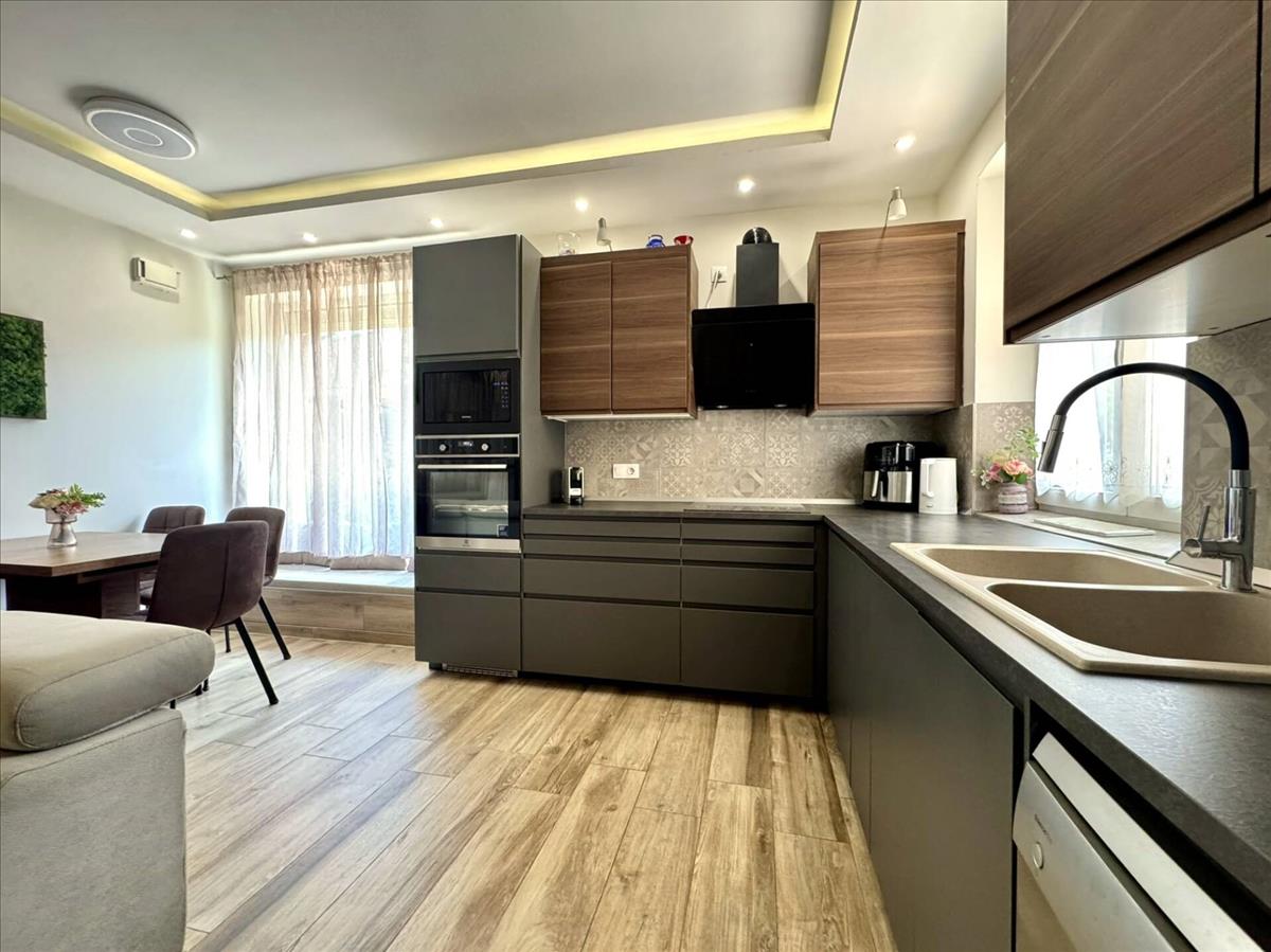 Az ingatlan belső tere világos, átgondoltan megtervezett: amerikai stílusú konyha, tágas nappali és étkező, három különálló, 12 m²-es szoba, előszoba, külön wc, valamint külön fürdőszoba káddal és walk-in zuhanyzóval. További praktikus helyiségek közé tartozik a háztartási helyiség és egy kamra.