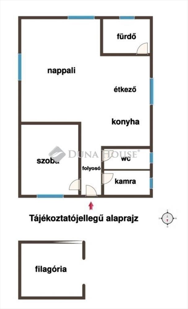 Helyiségei: - nappali, szoba, konyha - étkező, fürdőszoba, wc, kamra, 2 előszoba, folyosó - filagória (4mx 4m)