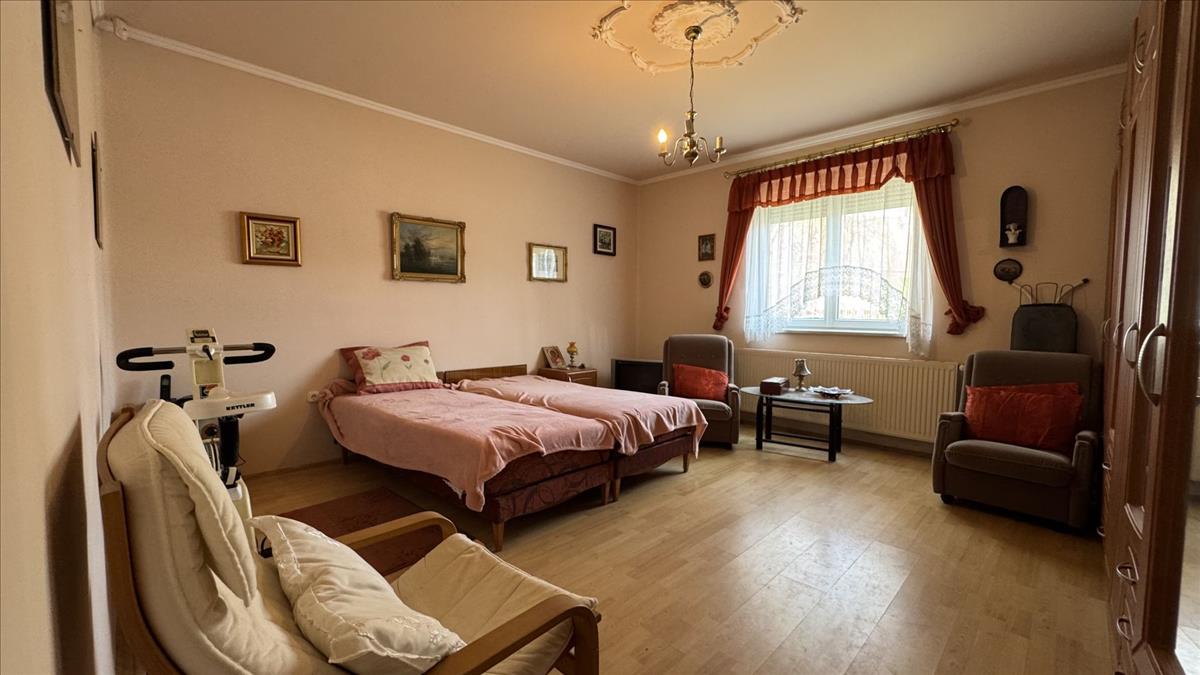 The property includes a 30 m² garage located in a separate building, as well as a 10 m² storage room. There is parking space for several cars on the lot. The garden is well-maintained, landscaped, and features a drilled well.