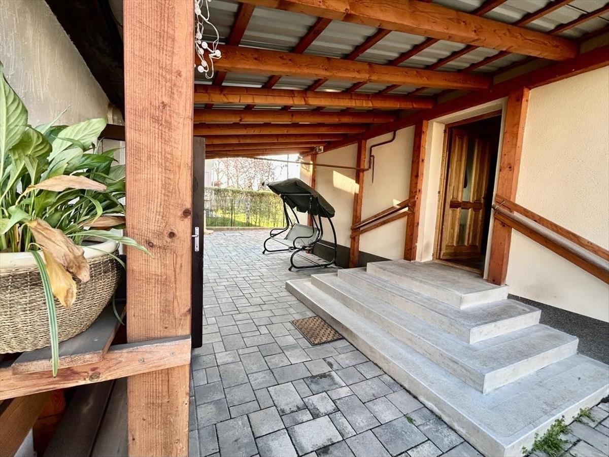 Az udvar nagy része térkövezett, a ház előtt szépen rendezett virágos-fás előkert található, mellette kerti sütögető hely, és veteményesnek egy rész.