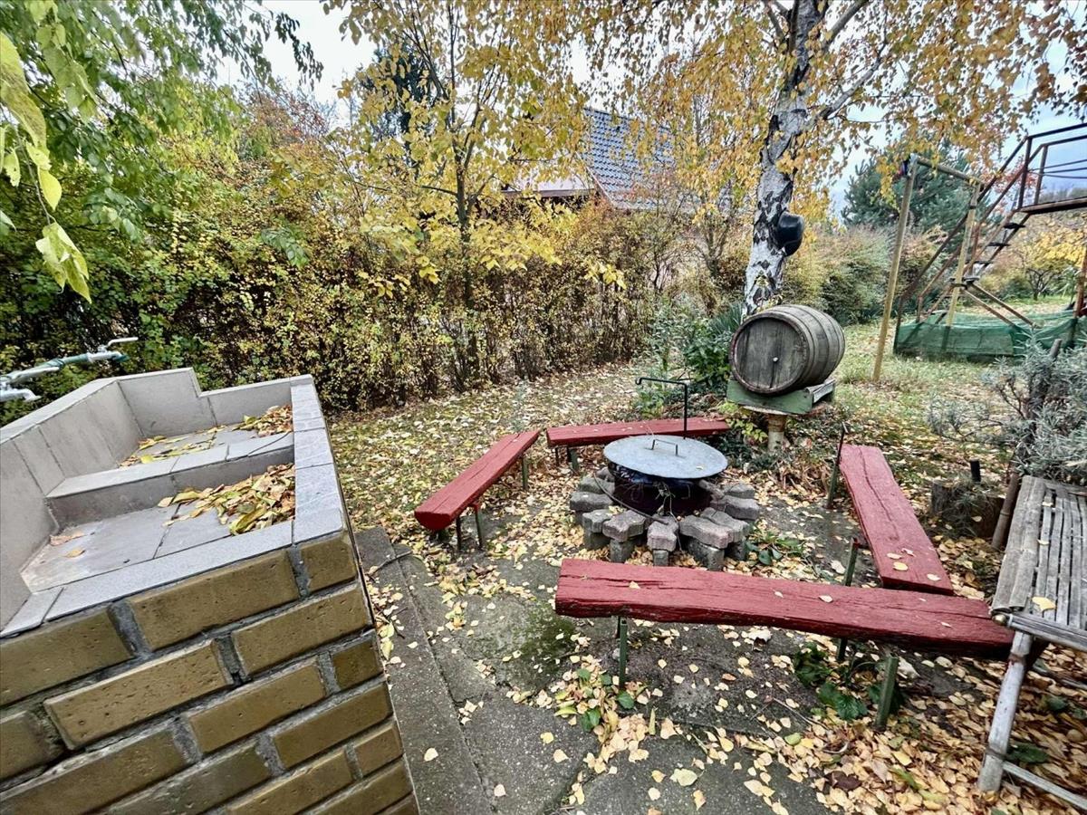 Az udvarban szőlőlugas, gyümölcsfák, gépkocsibeálló, kerti sütögető.