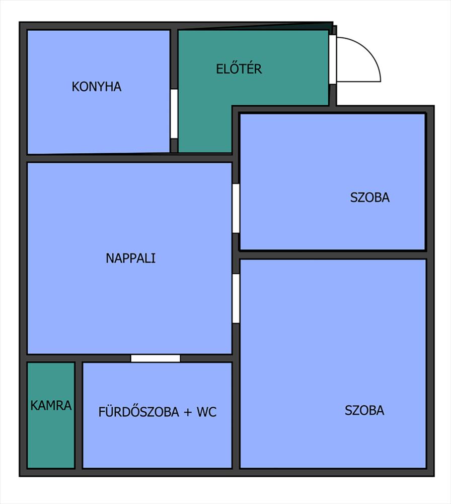 Helyiségek: 2 nagyméretű szoba, nappali + étkező, konyha, kamra, nagy alapterületű fürdőszoba WC-vel