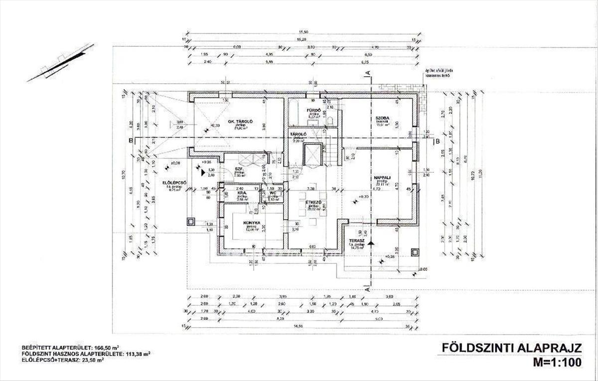A földszint helyiségei: szoba, előszoba, nappali és étkező ( 43 m2 ), konyha, kamra, tároló, fürdőszoba+wc, wc, garázs (22 m2) és terasz (15 m2).