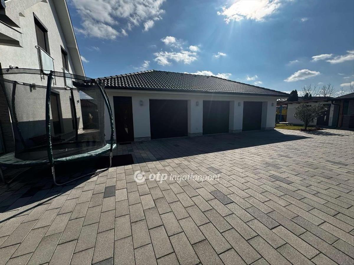 A ház mögött található egy 90 m2-es, 3 állásos, távvezérelhető, elektromos ajtóval ellátott garázs, melyben wc-k, zuhanyzó és egy kis konyha rész is kialakításra került.