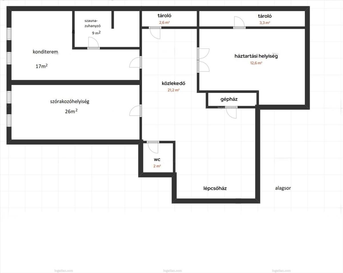 - Alagsor: Edzőterem, szaunák és zuhanyzó, szórakozóhelység/bar, mosókonyha/háztartási helyiség, 2 tároló, wc, gépház.