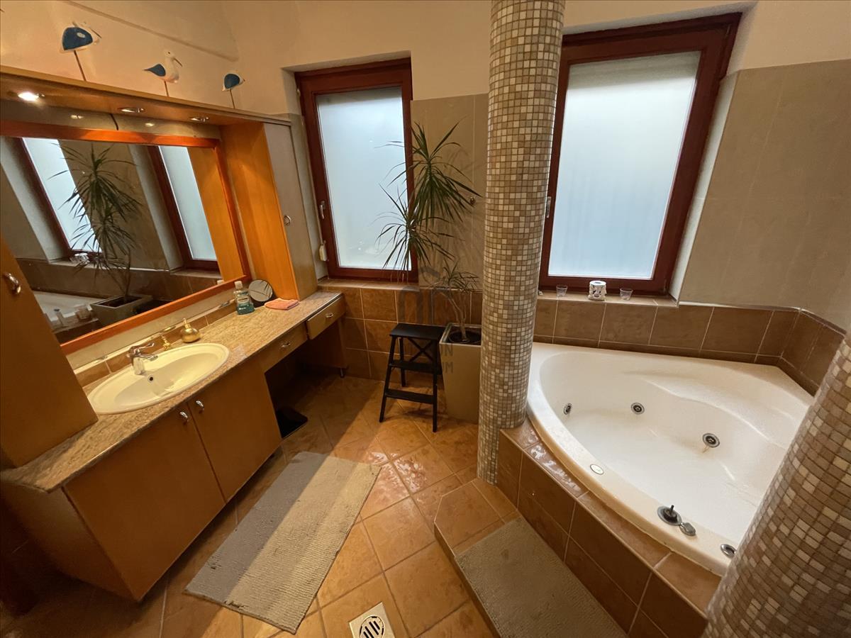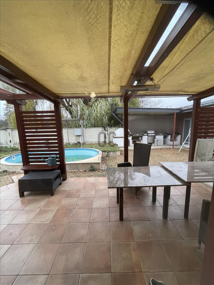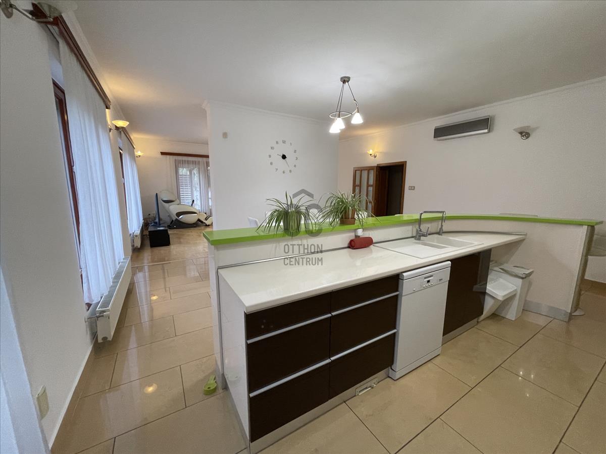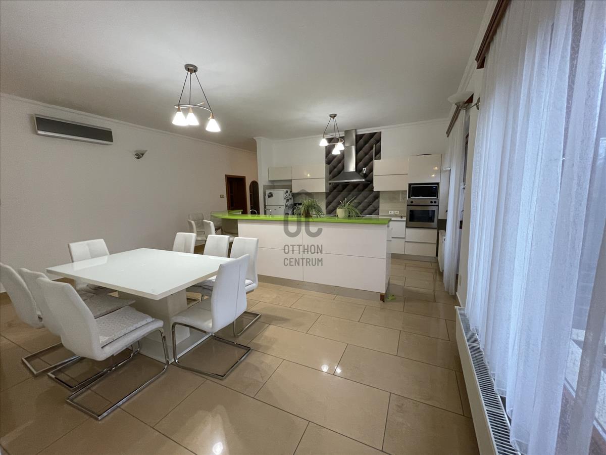 Helyiségei: hatalmas, világos, hangulatos konyha-étkező-nappali, 3 különnyíló szoba, 2 fürdőszoba (zuhanyzós és kádas), 2 wc, kamra, mosókonyha, gépészet, gardrób, dupla garázs.