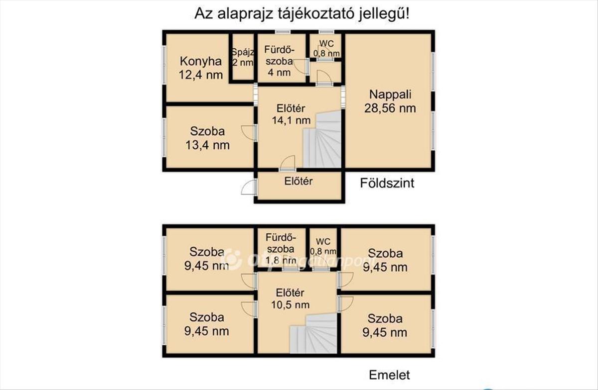 - földszint: konyha-étkező, spájz, hall, 1 külön nyíló szoba, előszoba, nappali, fürdőszoba és wc külön helyiségben