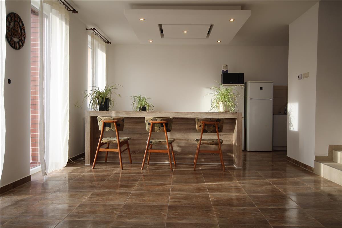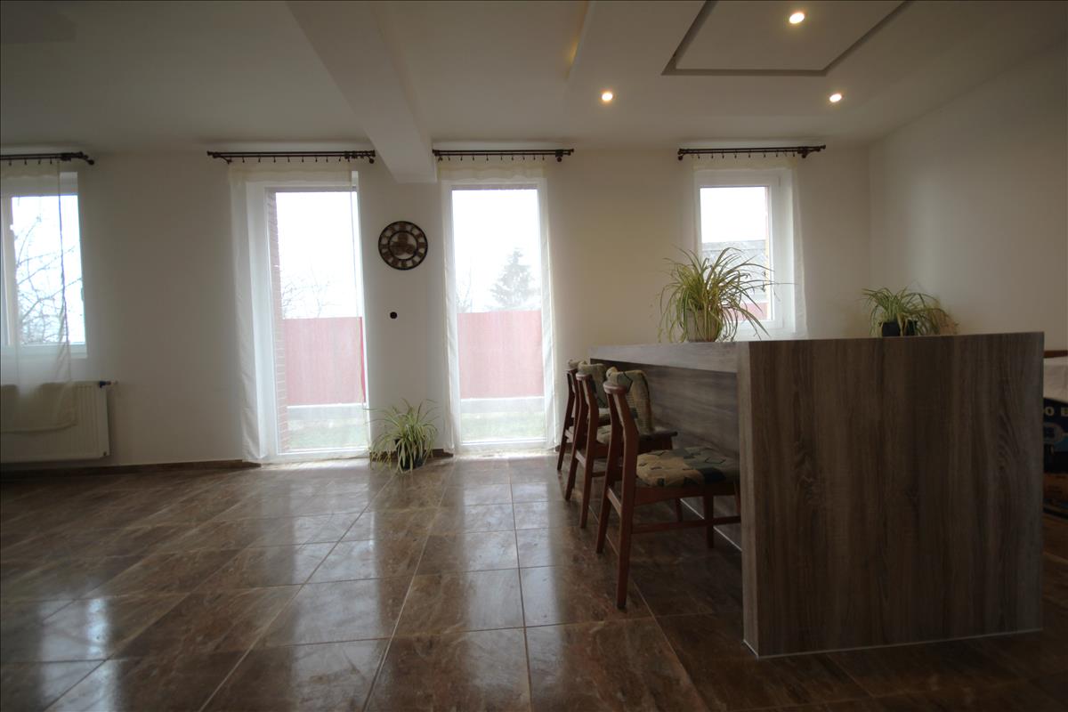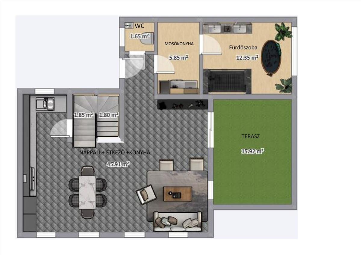 Világos, kényelmes használatú étkező és ideális méretű nappali számára is a kényelmes teret biztosít a nyitott egybefüggő terület. a nappali közvetlen teraszkapcsolattal rendelkezik.