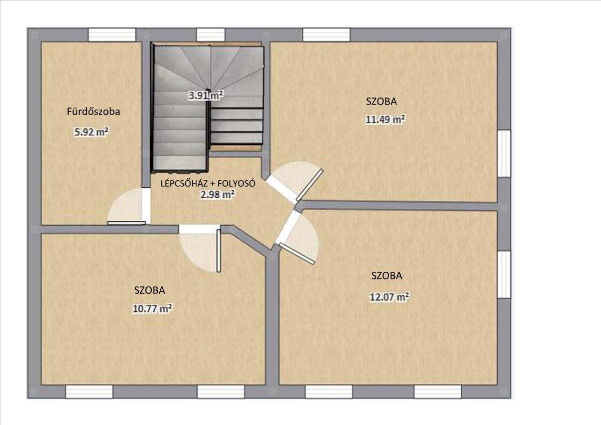 Emeleti szobái teljes belmagasságúak, nincsenek ferde falak, szobái francia erkéllyel rendelkeznek.