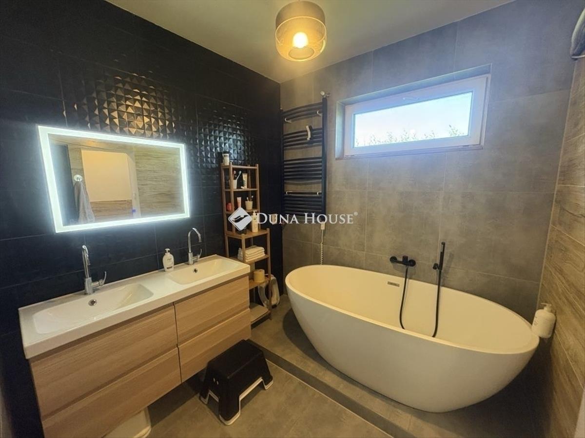Fürdő: nagy méretű, dupla mosdó, álló kád, zuhanyfülke