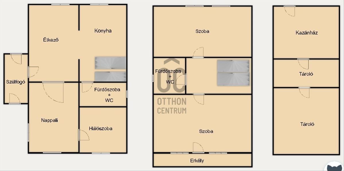 Az ingatlanban nappali, konyha-étkező és 3 szoba mellet, 2 fürdőszoba + wc helyiségek találhatók.