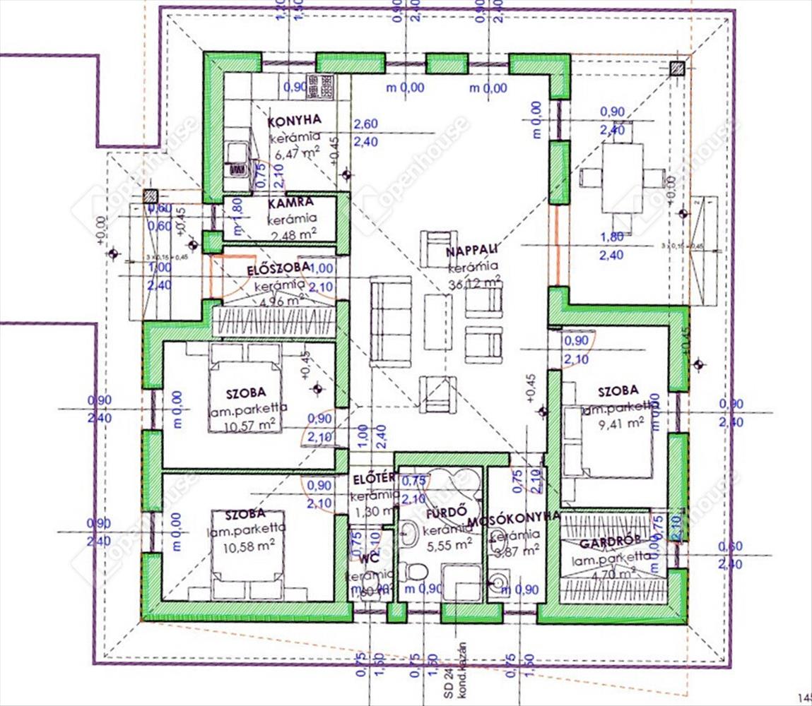 - a családi ház további helyiségei: spájz, mosókonyha, gardrób, és előszoba.