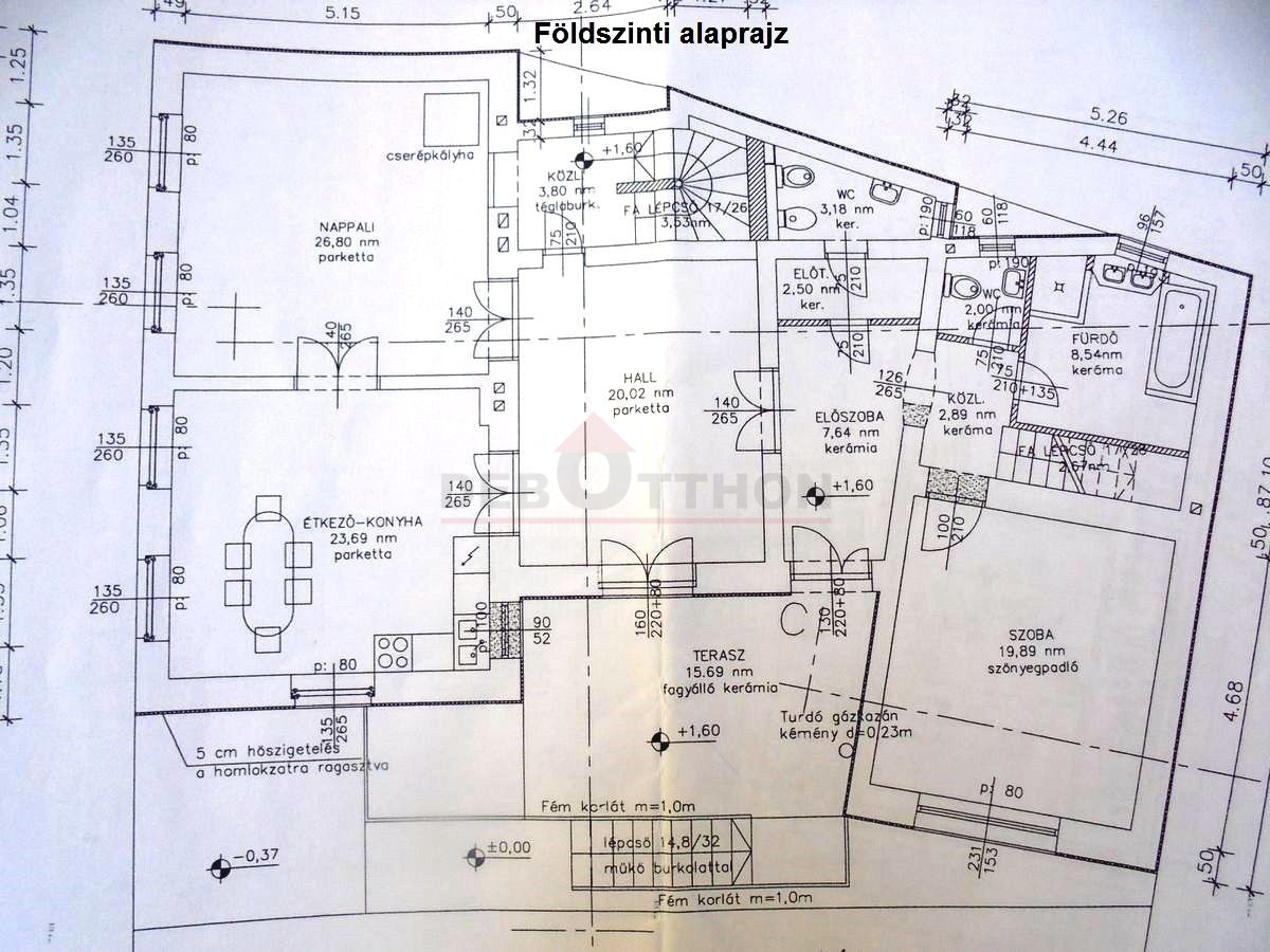 - az épület jellemzői: tégla alap és falazat, fa födémszerkezet, cserépfedés, külső hőszigetelés, pincepadló és falazat vízszigetelése, részleges tetőtér beépítés (bővíthető), padlástér hőszigetelése, részleges nyílászárócsere, a szintek közötti közlekedést acélvázas falépcső biztosítja, burkolt tágas terasz a bejáratnál